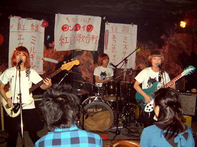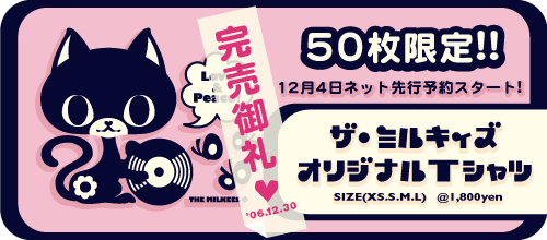 061231milkees1.jpg★30日の夜は梅田ハードレインでライブでした。その名も「コンバイン紅白歌合戦」。楽しかったー!そして泣いた!おかげさまでミルキィズ限定Tシャツ完売しました~ありがとうございます♪それにしても夜の太融寺(梅田)はやばい(昼もたいがいですが・・)。男性とすれちがうと指で数字を示されたりします。汗。